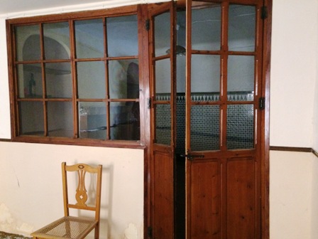 Al entrar hay un amplio recibidor, separado del salon con chimenea con unas cristaleras de madera.