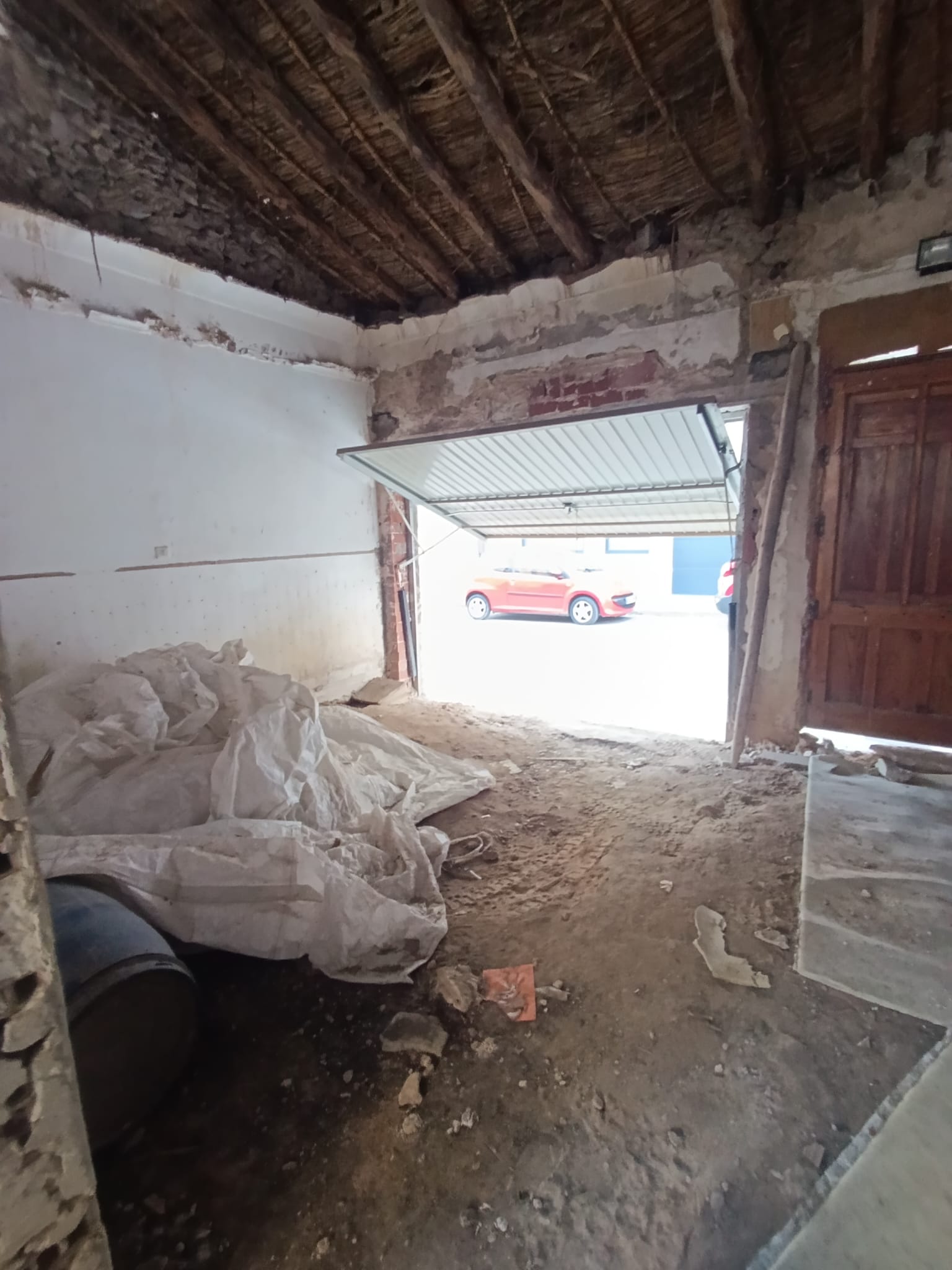 La casa tiene puerta de garaje, es como un adosado de una planta ya que todas las casas en la zona estan pegadas